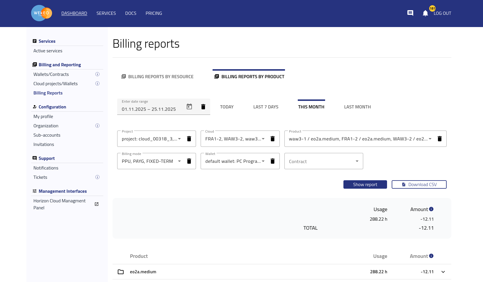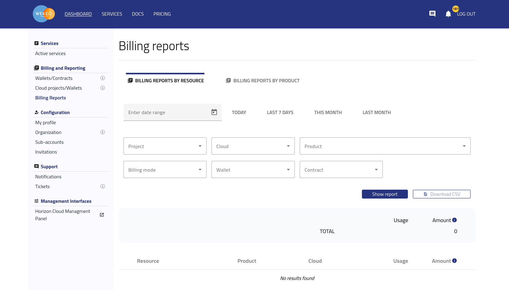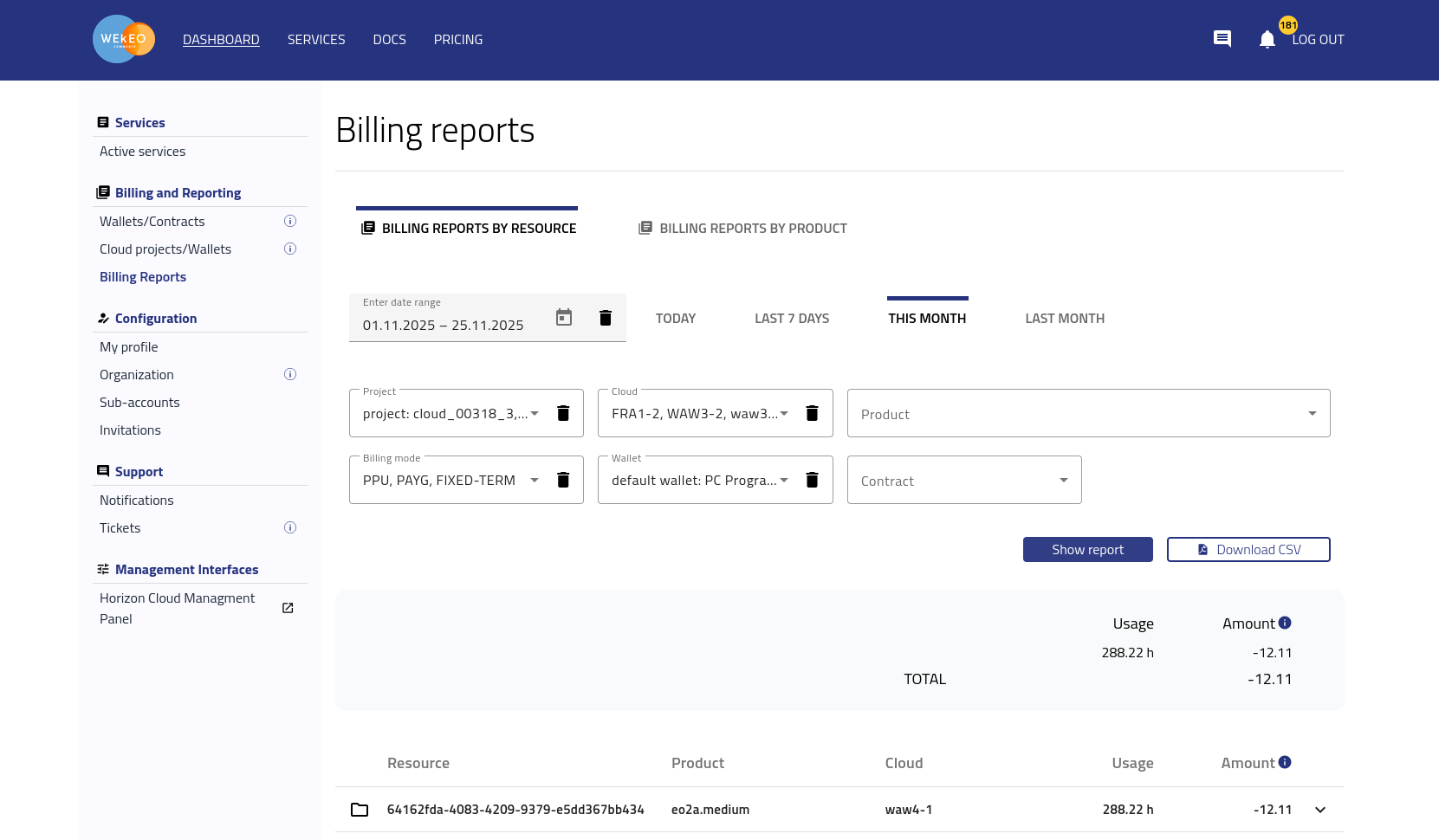 Monitoring cloud costs regularly helps you manage resource consumption and optimize spending. In the WEkEO Elasticity Dashboard, under Billing and Reporting → Billing Reports, you can view your usage and costs in two distinct ways: