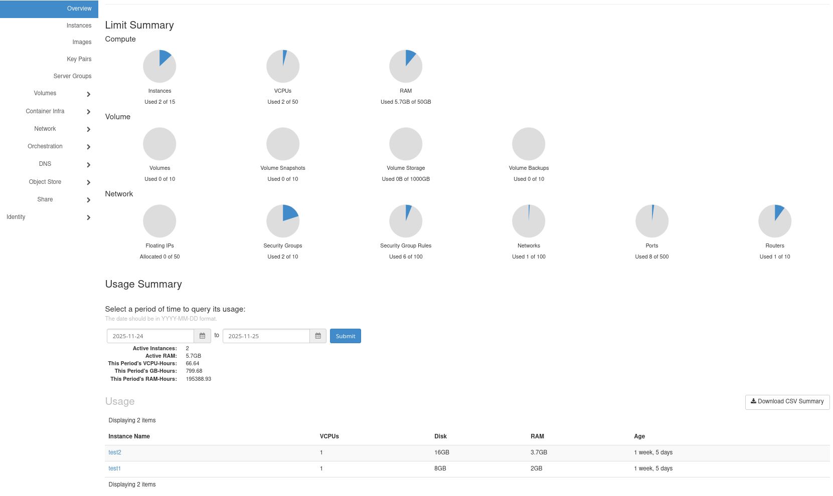 Before comparing billing reports, it helps to know which instances and flavors are active during the billing period. You can check this in Horizon → Compute → Overview → Usage Summary, as shown below.